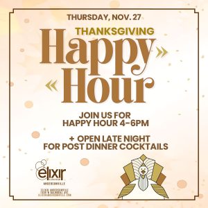 Join us on Thursday, November 27 for a special Thanksgiving Happy Hour from 4 PM to 6 PM, then keep the night going with post-dinner cocktails at Elixir Andersonville.